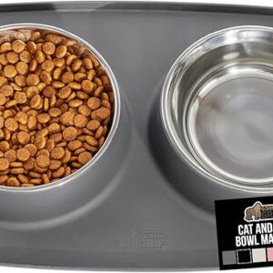 GORILLA GRIP Feeding Mat Set, Patent Pending 100% Waterproof BPA Free Silicone, Stainless Steel Cat and Dog Bowls, Slip Resistant, High Edges Catch Water Food, US Designed Pet Accessories, 2 Cup Gray