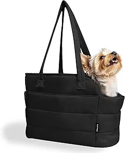 Lightweight Dog Purse Carrier for Small Dogs Under 15 lbs, Puffy Quilted Pet Carrier Tote for Puppies with Safety Leash Clip, Women's Hands-Free Dog Carrier Bag for Travel/Shopping (Black)