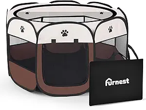 BHG Metal No-Assembly Freestanding Dog Gate with Door Walk Through, Extra Wide 144″, Extra Tall 32″ Pet Gate, Accordion Puppy Folding Playpen Dog Fence, with 2PCS Support (White, 6 panesl)