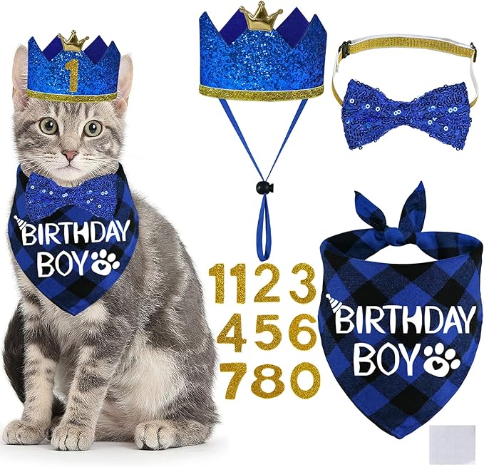 STMK Cat Birthday Party Supplies, Cat Birthday Hat with Numbers Bandana Bow Tie for Cats Birthday Decorations